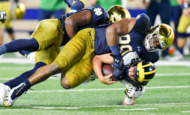 One quarter later, Notre Dame appeared destined to settle for a field goal and a 17-3 lead after coming up short on third-and-goal from the Michigan eight. That changed when Wolverine defensive end Chase Winovich was nailed for roughing the quarterback on the play, which led one play later to Armstrong’s second score of the game and a 21-3 advantage.