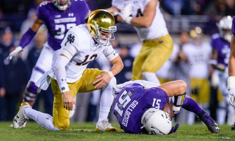 This is the hit Ian Book took in the first quarter at Northwestern. Played through it, but appears the impact to the ribs/back lingered beyond last Saturday night. pic.twitter.com/sLpy2omLmw
