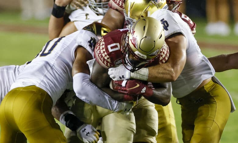 Let’s get the most obvious out of the way. The Notre Dame defense looked shaky to say the least, in Marcus Freeman’s coaching debut at Notre Dame. The Notre Dame defense was attacking early, and Florida State was only successful on a couple of big plays on breakdowns – precisely what we expected in a new defense that was thought to be more attacking than Clark Lea‘s.