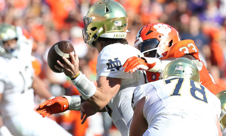 Both teams punted after that three-pointer, with missed tackles by the Irish on the latter punt giving Clemson possession past midfield. On the first play, the Tigers’ Phil Mafah blew past Notre Dame defenders for a 41-yard scoring run. After each team then notched field goals, the Tigers marched 75 yards on nine plays to make it 17-6. That was followed by Sam Hartman throwing a pick-six to Clemson’s Jeremiah Trotter, who stepped in front of Holden Staes and dashed 28 yards to boost the Notre Dame deficit to 18. The Irish managed to whittle three points off that number by halftime, though the effort marked the second time a Red Zone incursion failed to garner a touchdown.