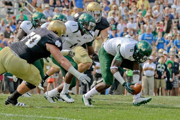 -I am not Bobby Diaco’s biggest fan. I’m tired of him playing so much zone, especially when we have very good cover corners, decent depth, and South Florida’s quarterback showed no ability to throw down the field accurately. I would rather get burned long once a game play press man coverage than have receivers simply slip into gaps. It seems to me like receivers rarely run routes against Notre Dame anymore; they just find a void in the zone where the quarterback can deliver the ball.