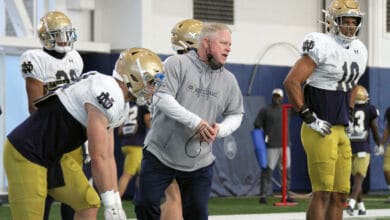 Throughout the Notre Dame’s fall camp Justin Yoon has struggled with consistency to the point that Brian Kelly talked about it in depth at Media Day on Wednesday. On Friday though, Yoon was seen nailing the 50 yarder seen above. Is it a sign of the sophomore kicker getting back on track?