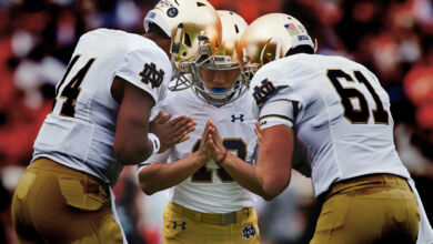 After this year’s NFL draft, Notre Dame took home third-place honors for having nine players selected. The Alabama Crimson Tide and Ohio State Buckeyes finished with just one more at 10. Although that is a ton of talent to lose at one time, it will not affect special teams much at all. It still has its trinity intact with fifth-year kicker Jonathan Doerer, junior punter Jay Bramblett, and senior long snapper Michael Vinson.