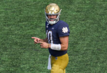 He connected with freshman wideout Jaden Greathouse three times for 68 yards and two scores. Adding a nice compliment to the aerial attack was Notre Dame’s tank, Audric Estime. The 227-pound bruiser led the team with 95 yards rushing (5.9 YPC) on 16 carries, including one touchdown. Sophomore running back Jadarian Price added his own score on a 19-yard run.