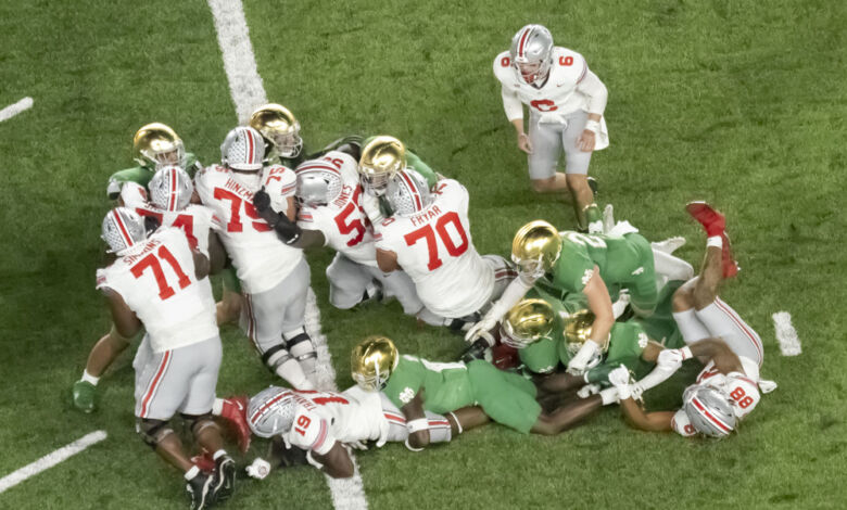 In the first instance, Buckeyes wide receiver Marvin Harrison managed to hold onto the ball with a circus catch at the Notre Dame 34. Instead, Benjamin Morrison was called for pass interference and the ball was placed at the Irish 48. Egbuka’s two subsequent catches got the ball to the Notre Dame 15, but his diving grab in the back of the end zone on the next play was ruled an incompletion.