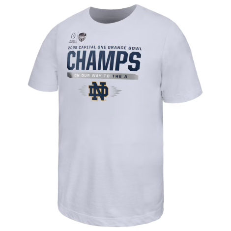 1. Notre Dame Fighting Irish Nike College Football Playoff 2025 Orange Bowl Champions Locker Room T-Shirt – White
